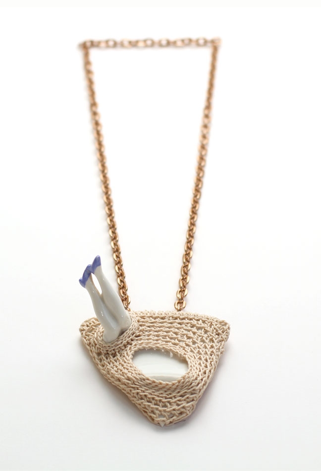 Laurence Verdier, Collier / tesson de céramique, jambes de porcelaine, chaine, fil de coton crocheté / pendentif: 8 X 6 x 4,8 cm